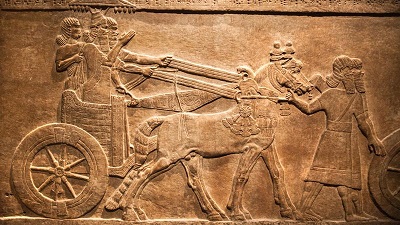 shows the king standing on his chariot, with his right hand raised in a greeting