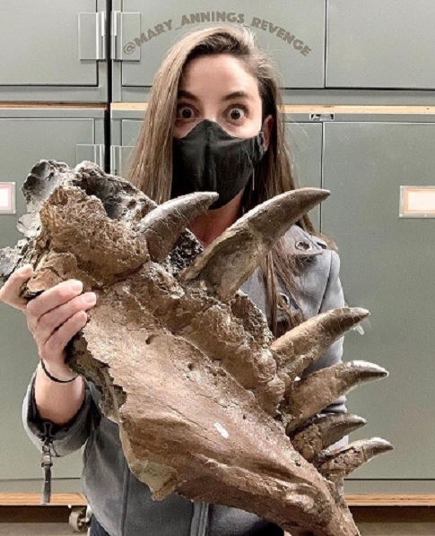Amy Atwater, paleontologist, holding a T. rex jaw.